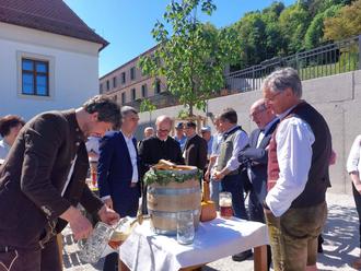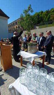 Berching/Klosterbetriebe Plankstetten. Abt Dr. Beda Sonnenberg OSB eröffnete das 21. Maibockfest, wie immer mit viel Charme und in diesem Jahr mit der feierlichen Einweihung und Segnung des neuen Biergartens am Kirchvorplatz. Die Ehre des Anstichs des Maibockfasses übergab der Abt diesmal an Maximilian Krieger von der Biobrauerei Riedenburger, die nach klösterlichem Rezept und mit regionalen Biozutaten das Plankstettener Maibockbier braut.