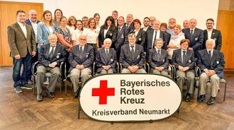 BRK/KV Neumarkt. Das Staatliche Ehrenzeichen wurde an Ehrenamtliche des BRK-Kreisverbandes Neumarkt für ihre langjährige aktive Mitgliedschaft verliehen. Landrat Willibald Gailler und BRK-Kreisgeschäftsführer Klaus Zimmermann überreichten im Beisein der BRK-Jugendrotkreuz Leitung Jasmine Regensburger und des stv. BRK-Kreiswasserwachtsleiters Christoph Herbaty den ehrenamtlichen Mitgliedern aus den Bereitschaften, den Jugendrotkreuzen und der Wasserwacht das Staatliche Ehrenzeichen in Silber für 25 Jahre, in Gold für 40 Jahre und das Große Ehrenzeichen für 50 Jahre aktive Dienstzeit. Große Anerkennung zollte Landrat Willibald Gailler den Mitgliedern für ihr außerordentliches Engagement. BRK-Kreisgeschäftsführer Klaus Zimmermann dankte den Bereitschafts-, Jugendrotkreuz- und Wasserwachtskameradinnen und -kameraden für ihre ausgezeichneten Leistungen. Die Geehrten erhielten zusammen mit dem Ehrenzeichen eine Urkunde, die der Bayerische Innenminister Joachim Herrmann im Namen des Freistaats unterschrieben hatte.