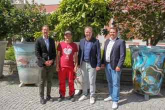 Verwaltungsdirektor Linus Sklenarz, Manuel Haubner, Oberbürgermeister Markus Ochsenkühn und Sebastian Schauer freuen sich über die Kooperation zwischen der Stadt Neumarkt und den JURA-Werkstätten Neumarkt (v. l. n. r.).