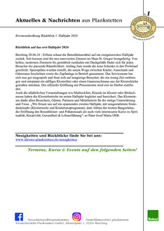 Auch die alljährlichen Veranstaltungen wie Maibockfest, Klassik im Kloster oder Biofachmesse haben die Klosterbetriebe im ersten Halbjahr begleitet und bereichert. Das Klosterteam dankt allen Besuchern, Gästen, Partnern und Mitarbeitern für die stetige Unterstützung und Treue. „Wir freuen uns auf ein spannendes zweites Halbjahr, mit neugestaltetem Erntedankmarkt (Klostermeile und Kindertanzprogramm), dem Abbau des letzten Baugerüstes, die Eröffnung des Benediktiner- und Prälatensaals als auch viele interessante Kurse zu Spiritualität, Kreativität, Gesundheit & Lebensführung“, so Pater Josef Maria OSB.