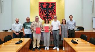 (V. li.): Rechtsdirektor Andreas Werner, Personalratsvorsitzender Karl Behninger, Randolf Körmer, Manuela Harenz, Oberbürgermeister Markus Ochsenkühn, Personalamtsleiterin Ruth Kirchinger-Epping, Verwaltungsdirektor Linus Sklenarz.