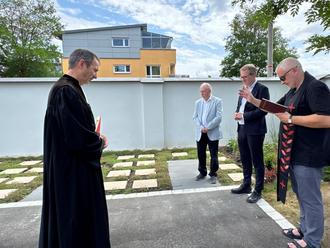 Stadt Neumarkt. Am 3. Juli 2025 wurde auf dem städtischen Friedhof in der Regensburger Straße feierlich eine neue Bestattungsart eingeweiht. Nach einer kurzen Ansprache durch Oberbürgermeister Markus Ochsenkühn segneten der katholische Pfarrer Krzysztof Duzynski und der evangelische Pfarrer Michael Murner das neu geschaffene Grabfeld mit Urnenerdrohren. Im neu gestalteten Bereich entlang der Friedhofsmauer in Richtung Schweninger Straße wurden 46 Urnenerdrohre aus Edelstahl im Erdreich installiert. Dieses Areal entstand auf dem Gelände freigewordener Familiengräber. Zusätzlich wurden außerdem Teile des dort verlaufenden Weges barrierefrei umgebaut und die Friedhofsmauer saniert. Die neue Bestattungsform ermöglicht es Bürgerinnen und Bürgern, ein Nutzungsrecht an einem Urnenerdrohr zu erwerben. Das jährliche Nutzungsentgelt beträgt 141,00 Euro. In jedem der Rohre können zwei biologisch abbaubare Urnen aus Maisstärke bestattet werden. Nach Ablauf der Ruhefrist von zehn Jahren ist eine Wiederbelegung möglich. Verschlossen wird jedes Urnenerdrohr mit einer individuell beschrift- und verzierbaren Gedenkplatte aus vorgegebenem Material und Format. Im Gegensatz zu den Urnenwänden kann die Platte mit einer Vase oder einem Grablicht versehen werden. Mit diesem Angebot reagiert die Stadt sowohl auf die stetig ansteigende Nachfrage nach Urnenbestattungen als auch auf den Wunsch nach einer pflegeleichten, aber dennoch persönlich gestaltbaren Grabstelle. Die Pflege der gesamten Anlage übernimmt die Stadtgärtnerei. Die Planung der neuen Anlage erfolgte durch Birgit Frank vom städtischen Umweltamt in Zusammenarbeit mit der Friedhofsverwaltung. Die bauliche Umsetzung übernahm der Bauhof.