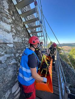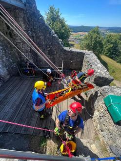Im Besonderen wurde dabei die einheitsübergreifende Zusammenarbeit beübt, welche im Alarmfall eine maximale Einsatzsicherheit für Feuerwehrdienstleistende und Patienten gewährleistet. Der besondere Fokus der Ausbildung liegt in der Teamarbeit, der Lageerkundung und -einschätzung und der sicheren Anwendung der Gerätesätze Absturzsicherung und Auf- und Abseilen. Als Übungsobjekt diente unter anderem die Burgruine Velburg. Am Abschlusstag verlangte eine Rettungsübung im unwegsamen Gelände im Umfeld der Burgruine den Teilnehmern alles ab, zur Mittagszeit herrschten bereits 30 °C im Schatten und steigerten sich am Nachmittag bis auf 35-36 °C.