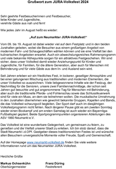 Das Volksfest ist eine wunderbare Gelegenheit, um gemeinsam zu feiern, zu genießen und die Vielfalt unserer Stadt zu erleben. Ich bin stolz darauf, dass die Stadt Neumarkt i.d.OPf. Gastgeber dieses traditionsreichen Festes ist und wünsche allen Besuchern unvergessliche Momente voller Freude, Spaß und Gemeinschaft.
