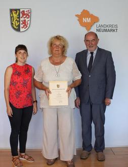 Ilona Werner aus Großbissendorf wurde von Landrat Willibald Gailler im Beisein von Anja Kreitmeier, Sachgebietsleiterin der Unteren Naturschutzbehörde, mit Aushändigung von Ernennungsurkunde und Dienstabzeichen zur Naturschutzwächterin für den Landkreis Neumarkt i.d.OPf bestellt. Damit ist Frau Werner nun bereit für den Einsatz in dem ihr zugeteilten Streifgebiet: der Marktgemeinde Lauterhofen und der Stadt Velburg. Das notwendige Wissen für die Tätigkeit als Naturschutzwächterin hat Ilona Werner zuvor im Rahmen der Naturschutzwächterausbildung durch die Bayerische Akademie für Naturschutz und Landschaftspflege in Laufen erworben. Diese besteht aus einem Online-Kurstag sowie einem einwöchigen Präsenzkurz und endet mit einer Abschlussprüfung, die Werner erfolgreich absolviert hat. Landrat Willibald Gailler bedankte sich bei ihr sehr herzlich für ihre Bereitschaft, sich in den Dienst der heimischen Natur zu stellen und wünschte ihr für das neue Aufgabenfeld viel Erfolg und Freude. Dieses besteht im Wesentlichen aus folgenden Bereichen: die Aufklärung von Bürgern vor Ort über den richtigen Umgang mit der Natur und den Schutzgebieten, die Überwachung der Einhaltung der Naturschutzgesetze, insbesondere in Landschafts- und Naturschutzgebieten sowie die Meldung von festgestellten Verstößen an die Untere Naturschutzbehörde.