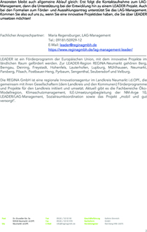 Ansonsten bleibt auch allgemeine Ablauf gleich: Erst folgt die Kontaktaufnahme zum LAG-Management, dann die Unterstützung bei der Entwicklung hin zu einem LEADER-Projekt. Auch bei den Formalien zum Förder- und Auszahlungsantrag unterstützt Sie das LAG-Management. Kommen Sie also auf uns zu, wenn Sie eine innovative Projektidee haben, die Sie über LEADER umsetzen möchten!