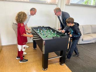 Davon überzeugten sich nun auch Oberbürgermeister Markus Ochsenkühn und Jürgen Weber, der das Sachgebiet Kinderbetreuung und Schulen leitet, bei einem Besuch vor Ort. Gemeinsam mit einigen Schülerinnen und Schülern testeten sie die Kicker. „Die Reaktionsgeschwindigkeit der Kids ist beeindruckend - ich fürchte, da hatten wir keine Chance“, gab das Stadtoberhaupt lachend zu.