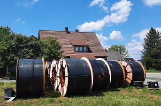 Zahlreiche Mikrokabelrohrverbünde auf großen Trommeln, stehen für den Breitbandausbau am Ortseingang von Wiesenfeld schon bereit.