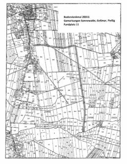 Flur 2 (Sonnewalde); Flurstücke (vollständig vom Bodendenkmal berührt) 6, 8, 13, 14, 17, 18, 22, 25, 28, 31, 35, 41, 50, 117, 118, 124, 215, 216, 346, 591, 593, 597, 640, 641, 642 – Flur 1 (Goßmar); Flurstücke (teilweise vom Bodendenkmal berührt) 186, 187, 209/8, 464 – Flur 1 (Pießig); Flurstücke (teilweise vom Bodendenkmal berührt) 91, 102, 177, 178, 181, 182, 183, 261, 266, 357, 358 – Flur 2 (Sonnewalde); Flurstücke (teilweise vom Bodendenkmal berührt) 1, 2, 3, 4, 5, 7, 9, 10, 11, 12, 15, 16, 19, 20, 21, 23, 24, 26, 27, 29, 30, 32, 33, 34, 36, 47, 48, 53, 54, 55, 77, 84, 104, 105, 106, 107, 115, 116, 119, 120, 121, 123, 132, 213, 217, 218, 219, 234, 340, 344, 345, 518, 519, 569, 570, 572, 574, 576, 578, 580, 582, 584, 586, 588, 592, 594, 595, 596, 598, 599, 635, 654, 716, 742