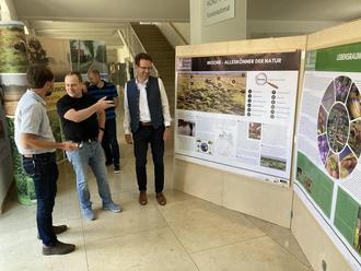 Bei der Ausstellungseröffnung informierten sich Landrat Peter von der Grün (vorne, v.r.), Donaumoos-Koordinator Gerhard Grande und Verbandsgeschäftsführer Michael Hafner (Foto: Janda/Donaumoos-Zweckverband)