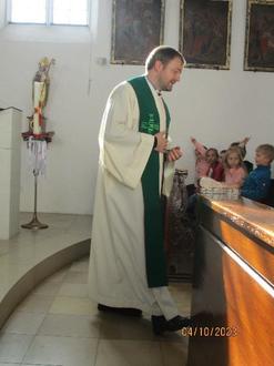 Dies war der erste Gottesdienst, den wir mit Pfarrer Stehl feiern durften und er erklärte mit viel Freude und Geduld wie ein Kreuzzeichen macht und was Erntedank bedeutet.