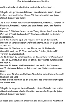 Ich gäb´ dir gerne einen Kalender, einen Kalender zum 1. Advent, in dem, versteckt hinter kleinen Türchen, etwas ist, was jeder Mensch braucht und kennt.