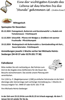 Anmeldung bis zum 16.12.2024 bei Frau Anneliese Göller Tel.: 09502-921161 oder bei Michaela Heintz-Seeberger Tel.: 09502-9449-37 oder 0170 -201 77 38