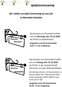 Die Senioren aus Herrnsdorf treffen sich am Freitag, den 13.12.2024 ab 14 Uhr in der Gastwirtschaft Herrmann zu einer Weihnachtsfeier.