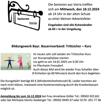 Die Senioren aus Vorra treffen sich am Mittwoch, den 18.12.2024 ab 14 Uhr in der alten Schule zu einer kleinen Adventsfeier