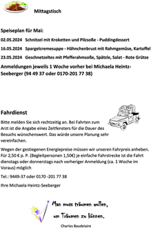 Bitte melden Sie sich rechtzeitig an. Bei Fahrten zum Arzt ist die Angabe eines Zeitfensters für die Dauer des Besuchs wünschenswert. Das würde unsere Planung sehr vereinfachen.