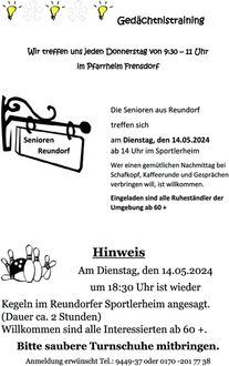 Die Senioren aus Reundorf treffen sich am Dienstag, den 14.05.2024 ab 14 Uhr im Sportlerheim