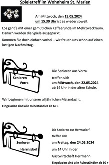 Die Senioren aus Vorra treffen sich am Mittwoch, den 22.05.2024 ab 14 Uhr in der alten Schule.