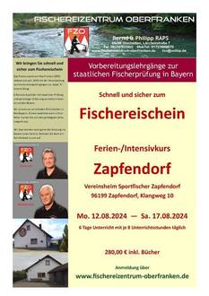 Das Fischereizentrum Oberfranken (FZO), größter Anbieter von Vorbereitungslehrgängen zur staatl. Fischerprüfung in Nordbayern, bietet in den Sommerferien 2024 die Möglichkeit, die Vorbereitung zur staatl. Fischerprüfung während der Schulferien an nur sechs Tagen zu absolvieren und damit den staatl. Fischereischein zu erlangen.