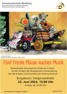 Besonders für das junge Publikum bringen die Kinder der musikalischen Früherziehung und der Jeki-Klassen der Kreismusikschule das musikalische Schauspiel „Fünf freche Mäuse machen Musik“ auf die Bühne. Gemeinsam mit vielen jungen Instrumentalisten der Bläser-, Akkordeon-, Gitarren-, Harfen-, Querflöten- und Blockflötenklassen sowie dem Kinderchor gestaltet die Muskischule das schöne Bilderbuch von Chisato Tashiro (Michael Neugebauer Edition GmbH) für ihre Zuschauer. Einlass erfolgt ab 14.30 Uhr, die Dauer beträgt eine Stunde.