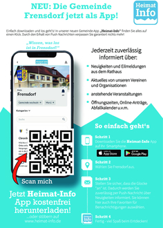 In unserer neuen Frensdorf App Heimat-Info“ erhalten Sie als Bürger oder Bürgerin sämtliche Informationen, wie News oder Veranstaltungen direkt aufs Smartphone oder Tablet. Die Heimat-Info APP steht kostenlos zum Download zur Verfügung.