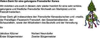 Unser Dank gilt insbesondere den Frensdorfer Kerwasburschen und –madla, der Freiwilligen Feuerwehr Frensdorf, den Gewerbetreibenden, den Schaustellern, sowie den Mitarbeitern des Bauhofs und der Verwaltung.