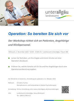 Eine bevorstehende Operation wirft oftmals Fragen auf und bereitet mitunter auch Angst. Darum geht es in einem Workshop am Mittwoch, 5. November, im Landratsamt Unterallgäu, Bad Wörishofer Straße 33 in Mindelheim im Raum 400. Beginn ist um 18 Uhr. Mentaltrainerin und Heilpraktikerin Christine Fischer vermittelt Techniken für eine mentale Vorbereitung auf die Operation und auf die anschließende Genesung. Das Angebot richtet sich an Patienten, Angehörige und Klinikpersonal. Organisiert wird die Veranstaltung vom Gesundheitsamt Unterallgäu. Die Teilnahme ist kostenlos, eine Anmeldung ist aus organisatorischen Gründen aber unbedingt erforderlich.