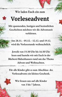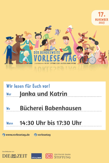Am 17.11.23 laden wir alle Kinder von 3-8 Jahren zum Bundesweiten Vorlesetag in die Bücherei Babenhausen ein. Ab 14:30 Uhr starten wir mit dem Vorlesenachmittag. Jeweils zur vollen Stunde gibt es spannende und lustige Geschichten und jeweils zur halben Stunden wird gebastelt. Es gibt Büchertipps für Kinder, Jugendliche und Erwachsene. Zur Stärkung bieten die Eltern-Kind-Gruppen Kaffee, Kuchen und Kinderpunsch an.