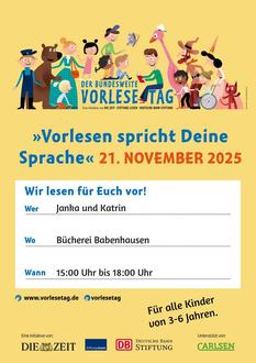Am 21.11.25 laden wir wieder alle Kinder von 3-6 Jahren zum Bundesweiten Vorlesetag in die Bücherei Babenhausen ein. Ab 15 Uhr starten wir mit dem Vorlesenachmittag. Jeweils zur vollen Stunde gibt es spannende und lustige Geschichten und jeweils zur halben Stunde wird gebastelt. Jedes Kind erhält eine Urkunde und eine kleine Überraschung.