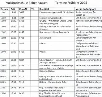 Die Anmeldungen können ab 01.01.2025 über die VHS Memmingen www.vhs-memmingen.de oder bei Sonja Rau-Schädle Tel. Nr. 08333/925022 Mail vhs-babenhausen@web.de erfolgen.