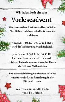 Am 21. November 2025 reihte sich die Gemeindebücherei Babenhausen wieder in die zahlreichen bundesweiten Vorleseaktionen ein. Bereits zum dritten Mal wurde, unter der Leitung des Vorlesestunden- und Büchereiteams ein toller Nachmittag mit lustigen und spannenden Geschichten angeboten. Ab 15 Uhr wurde über Zungenbrecher gestolpert, ein Waldbuchclub gegründet und mit Tommi Tatze gereimt. Für die zahlreichen kleinen und großen Besucher war es ein unterhaltsamer Nachmittag. Zur Abwechslung zwischendurch gab es die Möglichkeit kleine Tannenbäume und Lesezeichen zu basteln. Am Ende konnte jedes Kind noch eine Urkunde und ein Vorlesebuch, welches von der Stiftung Lesen gesponsert wurde, mit nach Hause nehmen.