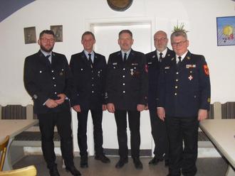 Auf dem Bild von links: Kommandant Chris Vögerl, Dieter Katheininger, Andreas Nägele, KBM Tobias Hiller, KBI Jakob Schlögel