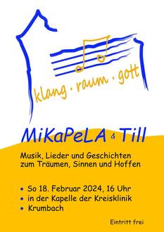 Unter dem Titel „Klang – Raum – Gott“ hat die Gruppe MiKaPeLA & Till mittlerweile schon 18 Konzert in Kapellen und Kirchen durchgeführt, um den Menschen diese oft unbekannten Gotteshäuser näher zu bringen. Mit ihrer Musik wollen sie die Besucher in diese Klang- und Gotteshäuser (ver)führen und gleichzeitig über die Frage nach Gott inspirieren. Die Konzerttour geht nun weiter zur Krankenhauskapelle in Krumbach am So. 18.02.24 um 16 Uhr.