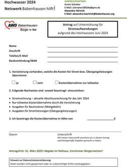 Ein Versprechen wird umgesetzt! Seit Montag, 24.02.2025, kann im Rathaus der Antrag auf Stromkostenzuschuss für Hochwasser-Betroffene abgeholt werden, auf der Homepage ist dieser ebenfalls abrufbar und hier im Anschluss. Bei Fragen wenden Sie sich gerne an das Vorzimmer, Fr. Hörtrich 08333/940031.