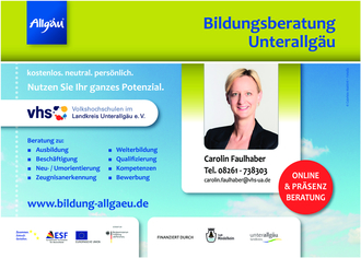 Vereinbaren Sie gerne einen persönlichen Termin unter carolin.faulhaber@vhs.de oder 08261 738 303. Die Beratung ist trägerunabhängig und kostenfrei. Gefördert durch die Stadt Mindelheim und den Landkreis Unterallgäu
