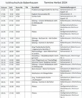 Die Anmeldungen können ab 12.07.24 über die VHS Memmingen www.vhs-memmingen.de oder bei Sonja Rau-Schädle Tel. Nr. 08333/925022 Mail vhs-babenhausen@web.de erfolgen.