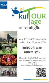 Die Unterallgäuer kulTOUR-tage gehen heuer zum ersten Mal über die Bühne und wurden vom Landkreis ins Leben gerufen, um sichtbar zu machen, wie reich der Landkreis an kulturellen Schätzen und künstlerischen Angeboten ist. Was im Einzelnen geboten ist, findet man in einer Broschüre, die bei den Unterallgäuer Gemeinden, im Landratsamt und bei vielen Mitwirkenden kostenlos zum Mitnehmen ausliegt. Online kann man das Heft auf der Homepage des Landkreises herunterladen unter www.unterallgaeu.de/kultourtage
