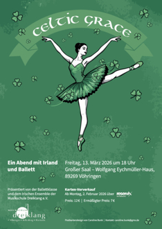 Unter dem Titel „Celtic Grace“ möchte das Ballettstudio unter der Leitung von Laura Braumüller und das Ensemble „The Irish Giggles“ unter Monika Häckh einen Abend mit Tanz und Musik einem breiten Publikum darbieten.