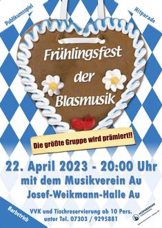 Der Musikverein Au lädt Euch ganz herzlich zum Frühlingsfest der Blasmusik in der Auer Josef-Weikmann-Halle ein. Es erwartet Euch ein abwechslungsreicher Abend mit