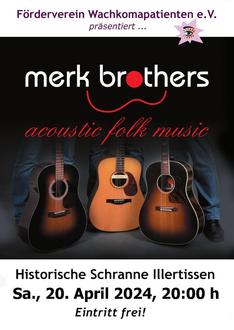 Folk vom Feinsten präsentieren die Merk-Brothers am 20. April 2024 in der Illertisser Schranne. Die drei Brüder aus Jedesheim haben sich in der Szene einen Namen gemacht. Seit mehr als 10 Jahren sorgen sie für ausverkaufte Locations und begeistern die Zuhörer mit Coverversionen sowie eigenen Interpretationen und Arrangements von herausragenden und bekannten Künstlern. Keine Show, keine Effekte. Nur Musik - ohne Schnickschnack, handgemacht und unplugged. Mit ihrem dreistimmigen, harmonischen Gesang und einer ausgefeilten Gitarrenarbeit wird die Musik aus der Blütezeit des Songwritings lebendig und stilgerecht auf hohem Niveau präsentiert.