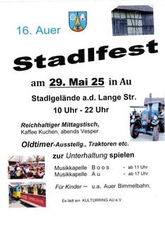 Der Kulturring Au lädt zu seinem altbekannten Stadlfest recht herzlich ein und freut sich auf ihren zahlreichen Besuch. Beginn ist um 10.00 Uhr mit einem Weißwurstfrühschoppen.
