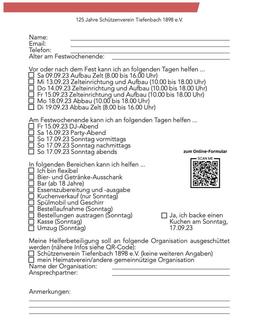 Wer sich als Helfer bei unserem SchützaFest vom 15.-17.09.2023 in Tiefenbach einbringen möchte, darf sich gerne über unser Internet-Seite https://www.125jahre-schuetzen-tiefenbach.info unter der Rubrik Helfer gerne melden. Alternativ kann auch der QR-Code auf dem Formular genutzt werden. Gerne auch das Formular der Festschrift Seite 52 verwenden und in unseren Briefkasten am Schützenheim einwerfen. Achtung: Nur bei Verwendung des vorgenannten Alternativen ist man wirklich angemeldet! Für alle Fragen dazu steht das Organisationsteam des Vereins gerne zur Verfügung.