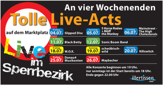 An allen vier Juliwochenenden heißt es wieder „Live im Sperrbezirk“: Die Bühne auf dem Marktplatz Illertissen wird zum Treffpunkt für regionale Musiker*innen und Bands aus verschiedensten Musikrichtungen – von Classic Rock über Blues, Volksmusik bis hin zu Blasmusik und Heavy Metal.