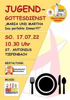 Die Ministranten aus Tiefenbach laden Euch alle ganz herzlich zum Jugendgottesdienst zum Thema „Maria und Martha - Das pefekte Dinner?!?“ ein.