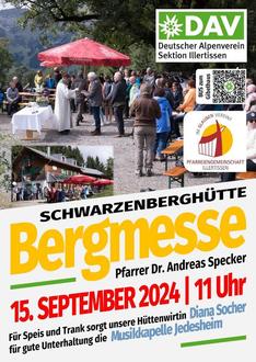Am Sonntag, 15. September 2024, ca. 11 Uhr feiert die kath. Pfarreiengemeinschaft Illertissen und die DAV Sektion Illertissen eine gemeinsame Bergmesse auf der Schwarzenberghütte im Hintersteiner Tal.