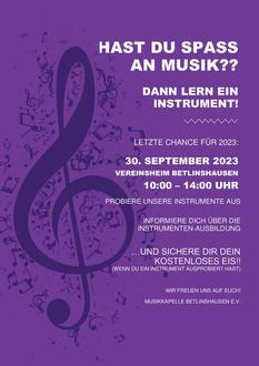 Beim Betlinshauser Garagenflohmarkt präsentieren wir unsere Ausbildungsinstrumente am Vereinsheim. Kinder und Jugendliche haben hier die Möglichkeit diverse Musikinstrumente auszuprobieren. Also schaut einfach mal vorbei.