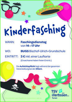 Die Turnabteilung des TSV Illertissen lädt alle Illertisser Grundschulkinder und Familien herzlich zum traditionellen Kinderfasching ein. Die Party steigt am Faschingsdienstag, 13. Februar, von 14.00 bis 17.00 Uhr in der Bischof-Ulrich-Grundschule. die kleinen Besucher dürfen am Spielparcours teilnehmen und mit dem Betreuerteam spielen und zu tanzen. Fürs leibliche Wohl ist bestens gesorgt.