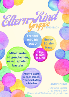 Mit der Fertigstellung der Renovierung des Erwin-Bürzle-Hauses kann auch die Eltern-Kind-Gruppe wieder in ihre Räumlichkeiten ziehen. Wir starten ab Ende Oktober / Anfang November und treffen uns immer Freitags von 9:30 bis 10:30. Die Größe der Gruppe ist auf 12 Kinder begrenzt, sonst wird es zu viel für Kinder und Eltern. Bis Ende Oktober können sich alle Interessierten anmelden unter: Eltern.Kind.Tiefenbach@gmail.com.