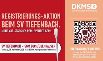 Am Sonntag, den 9. November 2025 ab 13:30 Uhr lädt der SV Tiefenbach gemeinsam mit der SGM Buch/Obenhausen zur DKMS-Registrierungsaktion auf dem Waldsportplatz Tiefenbach ein.