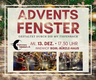 Mit musikalischer Umrahmung durch die Flötenkinder, Jungmusiker und Musiker eröffnet die Musikvereinigung Tiefenbach am Mittwoch 13.12., um 17.30 Uhr, im Innenhof des Bgm.-Bürzle-Hauses ihr Adventsfenster. In weihnachtlicher Atmosphäre freuen wir uns bereits heute ganz besonders auf die musikalischen Darbietungen.